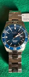 Meraviglioso orologio TECNOTEMPO sportivo ed elegante. Cassa 42mm, vetro zaffiro, corona e fondello a vite con valvola ad elio, WR 500 mt. Dial blu intenso con inserti acciaio e bianco luminescente. Data alle ore 3,Lunetta in ceramica blu su ghiera unidirezionale e stampa bianca incisa. Bracciale acciaio logato. Orologio full set con astuccio a bauletto nero rigido, granzia internazionale che inizia con data 03/10/25 per due anni.