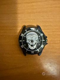 Vendo come pezzi di ricambio orologio stile teschio colore nero. Orologio non funzionante, lancette non girano correttamente. Movimento al quarzo, batteria 626. Maglie aggiuntive del cinturino a parte.