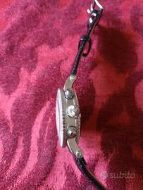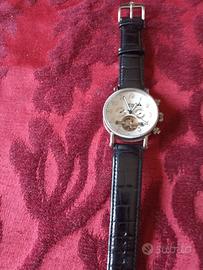Orologio Theorema a carica automatica, quadrante bianco con finestra per la data alle ore 13 e 2 contatori supplementari per giorno della settimana e il mese. Design "Open Heart" alle ore 6 è visibile il bilanciere del movimento che permette di osservare il battito interno. Modello molto bello e raro perché non più in produzione.