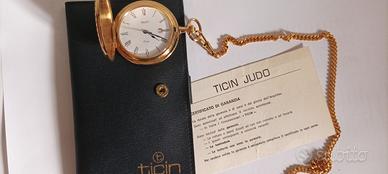 Orologio al quarzo da tasca Ticin Judo con catena mai utilizzato, cassa lavorata.