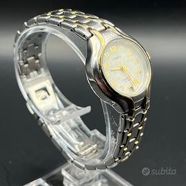 Bellissimo orologio da polso Timex Indiglo da donna, caratterizzato da un raffinato design bicolore (argento e oro) e un particolare quadrante con texture a nido d'ape. Un accessorio versatile, perfetto sia per l'uso quotidiano che per occasioni più formali. Caratteristiche principali: • Marca: Timex • Modello: Indiglo con funzione datario (fine-strella a ore 6). • Quadrante: Bianco/Panna con motivo geometrico a nido d'ape e numeri arabi dorati ben leggibili. • Cinturino: Bracciale a maglie in acciaio inossidabile bicolore (silver/gold) con chiusura a scatto. • Resistenza all'acqua: WR 50 Metri (idoneo per brevi nuotate o doccia). Tecnologia Indiglo: Il quadrante si illumina premendo la corona (ideale per la visione notturna). • Batteria: nuova Condizioni: L'orologio è in buone condizioni estetiche. Presenta leggeri e normali segni di usura (piccoli graffi superficiali) sul vetro e sul fon- dello, come visibile in foto, che non ne compromettono l'utilizzo. Tag (Hashtags) #Timex #OrologioDonna #Indiglo #Timex- Watch #OrologioBicolore #VintageWatch #AccessoriDonna #OrologioClassico #Wr50m