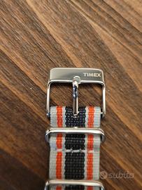 - Cinturino in cordura a fantasia righe gialle, blu scuro e verdi con logo timex.