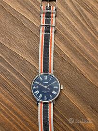 - Cinturino in cordura a fantasia righe rosse, grigie e blu logo timex sulla fibbia.