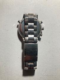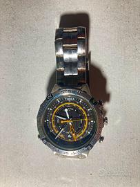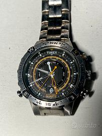 Orologio Timex Intelligent Tide-Temp-Compass (modello T2N738). Fa parte della serie Expedition Adventure ed è progettato per attività all'aperto grazie a complicazioni analogiche avanzate gestite da una quarta lancetta dedicata Funzioni Speciali: * Bussola Digitale: Indica i punti cardinali e permette la regolazione dell'angolo di declinazione. * Indicatore delle Maree: Traccia il tempo rimanente fino alla successiva alta o bassa marea. * Termometro: Misura sia la temperatura dell'aria che quella dell'acqua (se immerso). * Illuminazione INDIGLO:Premendo la corona, l'intero quadrante si illumina uniformemente per la visione notturna. * Specifiche Tecniche: * Materiale: Cassa e bracciale in acciaio inossidabile. * Dimensioni: Cassa rotonda da 45 mm (o 46 mm a seconda delle fonti) con uno spessore di circa 12 mm. * Resistenza all'acqua: Fino a 100 metri (10 ATM), adatto per nuoto e snorkeling. * Vetro: Cristallo minerale resistente ai graffi. Funzionante . Cinturino con chiusura lucchetto Anche ritiro in zona
