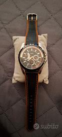 L'orologio Timex quadrante nero ha accenti di arancione e di bianco. Cassa in acciaio e cinturino in gomma nero e arancione con gancetto in acciaio.