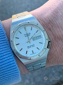 Orologio nuovo-fondo di magazzino. Primi Anni 80 circa. Wr 100mt, corona a vite, datario completo. Cassa 36mm Mov Eta/Esa 536-121 Batteria nuova.