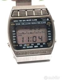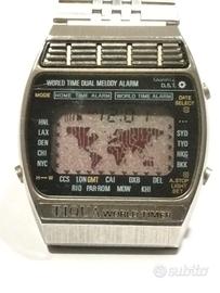 Orologio Tiqua World Timer fine anni 70, equivalente in tutto al mitico Seiko A 239. Perfettamente funzionante,illuminazione e suoneria ok. Possibilità di visualizzare l' intero mappamondo per controllare un secondo fuso orario. Bellissima funzione, introvabile su nessun altro orologio. L' orologio racchiude tutte le caratteristiche di un orologio lcd, con l' ulteriore funzione del doppio orario. Molto utile a chi viaggia spesso o semplicemente per avere un accessorio vintage unico.Prezzo trattabile.