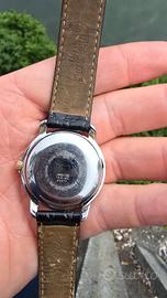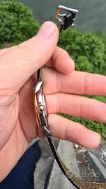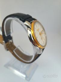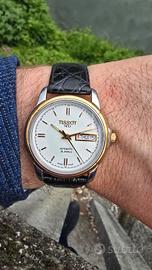 Descrizione Splendido orologio Tissot 1853 Automatico, un classico intramontabile che unisce l'eleganza svizzera a un design versatile. Perfetto sia per un polso maschile sottile (stile vintage) che per un polso femminile. Caratteristiche Principali: Movimento: Meccanico a carica automatica (25 Jewels), garanzia di precisione e durata nel tempo. Dimensioni: Diametro cassa 35,7mm (esclusa corona). Quadrante: Bianco con texture guilloché a cerchi concentrici, indici dorati applicati e doppia finestra giorno/data a ore 3. Estetica: Elegante finitura bicolore con corona logata. Cinturino: In pelle nera stampa coccodrillo (ottime condizioni). Condizioni: L'orologio è perfettamente funzionante e tenuto con estrema cura. Accessori: Venduto con la scatola originale Tissot.