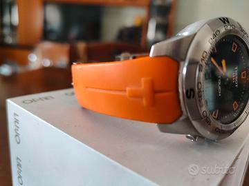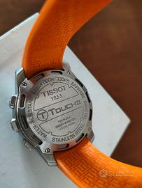 TISSOT 1853 T-TOUCH II Ref: T047420 A Seriale: 14BC0473058 Versione Sport / Outdoor. Cinturino in gomma arancione con fibbia T640.1AA e cassa in acciaio. Movimento: Swiss ETA E48.351 al quarzo tattile Funzioni: altimetro, barometro, bussola, cronometro, termometro, meteo, allarme, datario Cassa: Stainless Steel (acciaio inox) - dimensioni 42.7mm - spessore 14.6mm Vetro: Sapphire Crystal (zaffiro touch screen) Tipologia di quadrante: Indici Water-Resistant 10 bar (100 m / 330 ft) Condizioni perfette, come nuovo, senza graffi. Perfettamente funzionante, vendo per inutilizzo.