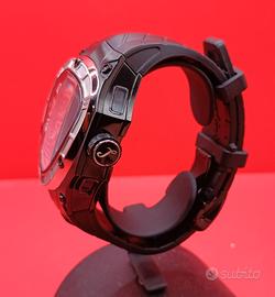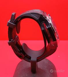Porto alla vostra attenzione un iconico orologio dell'azienda Tonino Lamborghini, orologio dallo stile sportivo e dal design unico e particolare il modello Lamborghini Spyder Glass RG6H033 automatico,nuovo completo della sua scatola originale, disegnato nel centro stile di Tonino Lamborghini, orologi che nascono dalla passione per l'orologeria e il design, oltre che per la meccanica e l'ingegno come quello impiegato per la realizzazione delle sue famose macchine sportive. Questo particolare orologio Lamborghini Spyder Glass RG68 automatico e caratterizzato dalla cassa nera assimetrica a forma di scudo il quale richiama il logo del brand.La cassa realizzata in acciaio PVD di colore nero misura 53mm corona compresa, mentre senza misurare la corona misura 48mm,in entrambi i lati della cassa presenta delle aperture in vetro dalle quali e possibile visionare il movimento automatico svizzero ETA 2824-2, la corona in acciaio riporta incisa la "L" del marchio Lamborghini, svitando la stessa in senso antiorario e possibile impostare l'orario e la data,una volta impostato l'orario e la data la corona và vitata in senso orario, monta un vetro minerale con rivestimento zaffiro antigraffio nel quale vi e ancora la pellicola protettiva,il quale e privo di graffi e segni,il suo particolare cinturino da 18mm in silicone di colore nero richiama il disegno dei pneumatici, mentre la chiusura deployante a forma di scudo, riporta inciso in 3D il Toro, molto bello e il suo quadrante con trama in fibra di carbonio a nido d'ape, presenta una numerazione in numeri arabi mentre le sue lancette rosse richiamano lo stile sportivo dell'orologio,a ore tre vi è il datario mentre a ore 12 vi e raffigurato un Toro che carica, infine monta un fondello in parte di colore nero anch'esso a nido d'ape con al centro un vetro zaffiro antigraffio dal quale e possibile visionare il suo movimento automatico,nello stesso vi sono riportati i numeri di referenza dell'orologio e la scritta resistente all'acqua.