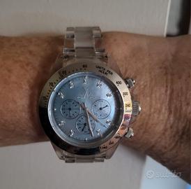 Orologio cronografo con cinturino a maglie trasparenti (disponibili anche 3 maglie aggiuntive); ore con brillantini, fondo azzurro argentato, usato pochissimo come nuovo