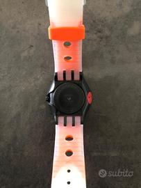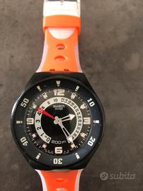 Orologio Swatch Fun Scuba "Moray's Bite" modello SUGB200 cinturino bicolore arancione e bianco. - Quadrante nero con dettagli rossi. - Resistente all'acqua 200m. - Chiusura con fibbia in plastica bianca. - Pila nuova.