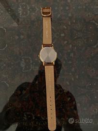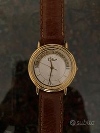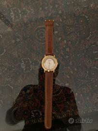 Cassa dorata con quadrante bianco, numeri romani e datario interno numerico (1-31). Movimento al quarzo perfettamente funzionante. Cinturino in vera pelle marrone, comodo e ben conservato.