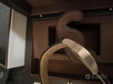 La corona chiusa a pressione è di forma trapezoidale ed è zigrinata e personalizzata con il marchio della casa. Fondello bombato e serrato da 8 viti. Il quadrante, color grigio antracite ha una doppia incisione, a guilloché nella parte centrale e ad effetto soleil nella parte più esterna; indici triangolari serigrafati e numeri arabi ai quarti in rilievo, lancette Dauphine, Cinturino in cuoio nero con chiusura déployante in acciaio. Impermeabilità garantita fino alla pressione di 3 atmosfere. Movimento meccanico a carica automatica, riserva di marcia di ben 38 ore Ful set con certificati originali