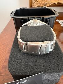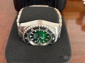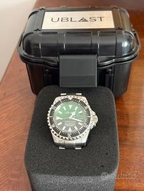 Vendo orologio Ublast Ocean king CASSA: in acciaio inossidabile 316L - con valvola rilascio dell'elio - antimagnetico • GHIERA: ceramica opaca - girevole unidirezionale a 120 scatti - numeri, indici, inserto a ore 12 luminescente • DIAMETRO CASSA: 44,8 mm • ALTEZZA CASSA: 20 mm • FINITURA: spazzolata • CORONA: a vite • FONDELLO: a vite • VETRO: zaffiro • RESISTENTE ALL'ACQUA: 200 ATM - 2000 metri - 6500FT • MOVIMENTO: automatico swiss made sellita SW200 - 38 ore di riserva - 26 rubini QUADRANTE: lucido con indici e lancette luminescenti • CHIUSURA: deployante in acciaio inossidabile • CINTURINO: in acciaio inossidabile 24 mm con estensione per muta Il venditore dichiara che il bene oggetto del presente annuncio è originale.
