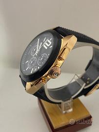Collezione: MOVE Alimentazione/Movimento: Al quarzo Tipo carica: Al quarzo Display: Analogico Funzioni: Cronografo Impermeabilità: 10 ATM water resistant Materiale cassa: Acciaio Colore cassa: Oro rosa Colore quadrante: Nero Materiale cinturino: Pelle Colore cinturino: Nero Diametro cassa (mm): 44 Spessore cassa: 11 Orologio con movimento al quarzo da uomo con cassa in acciaio mm 42 ghiera nera e parti laterali color rame , quadrante nero a strisce verticali con sfere fosforescenti , index in acciaio e datario tra il 4 e il 5 . Corona a pressione con vero diamante naturale e cassa WR 10 atm . Cinturino in gomma nera con fibia in acciaio "rame" .