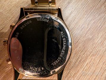 Vendo causa inutilizzo Orologio in acciaio Fossil color oro con quadrante nero. L'orologio è perfettamente funzionante, va solo sostituita la batteria. Sono presenti anche le maglie aggiuntive e la scatole in metallo.
