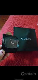 Orologio uomo Guess con cinturino in pelle nero a fascia larga che ricopre anche la parte inferiore della cassa e con chiusura con fibbia.