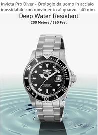 Bellissimo orologio uomo in acciaio inossidabile Invicta pro diver cassa 40 millimitri water resistent 200 metri completo di corredo e maglie in perfetto stato.. Prezzo non trattabile..