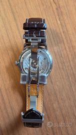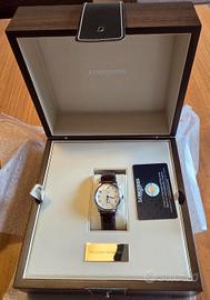 Orologio nuovo ancora co fezionato mai usato Longines Master Collection con riserva di carica. • Quadrante: Colore argento con decorazione a "chicchi d'orzo", numeri arabi neri e lancette in acciaio azzurrato. • Cassa: in acciaio inossidabile con un diametro di38,5 mm. • Funzioni: Oltre all'indicazione dell'ora, include un datario a ore 3 e unindicatore della riserva di carica(fino a 42 ore) posizionato a ore 6. • Cinturino: In pelle di alligatore marrone con chiusura déployante