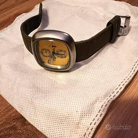 Cronografo Lotus con bellissimo quadrante giallo cassa in acciaio brunito. Molto particolare la firma della cassa quadrata ma molto stondata agli angoli. Buone condizioni.
