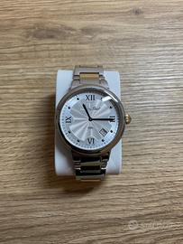 Cassa in acciaio e oro placcato, 41 mm, vetro in zaffiro, resistente all'acqua 30 mt. Movimento al quarzo.