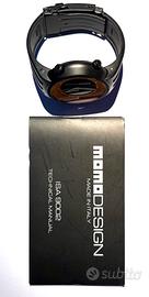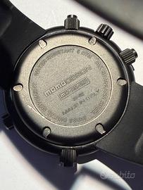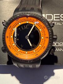 Momo Diver Explorer, MD-182-EXP. All black PVD Stainless steel case and vibrant orange dial with analog/digital display. Luminous markers and hands for nighttime use. Inner rotating bezel with compass. Black rubber strap with a tri-fold deployant clasp. Watch functions: Alarm, chronograph, 3 time zones, compass, countdown timer, day-of-week. Ottime condizioni, vetro e cassa senza graffi evidenti, lieve abrasione sul fondello a causa apertura per sostituzione batteria. Perfettamente funzionante