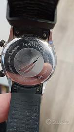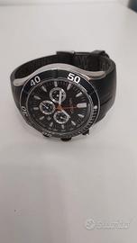 Movimento al quarzo cronografo con datario. Cassa in acciaio mm 44. Quadrante nero, con indici bianchi. Impermeabilità 10 atmosfere. Cinturino in silicone con fibbia. custodia originale