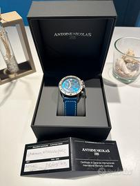 Orologio nuovo Antoine Nicolas! Ancora con tutte le pellicole! Certificato di autenticità e garanzia! Valore da sito 949€!!! (Vedi foto) Cassa: Ø 43 mm, acciaio Finish: brushed Spessore cassa: 12mm Vetro: minerale Corona: acciaio, serrata a vite Fianco: acciaio solido, serrato con vite Quadrante: opaco o a raggi di sole con indici stampati luminosi e lancette opache con inserti luminosi. Lancette: opache con inserto luminoso. Strap: in pelle, 22 mm Fibbia: ad ardiglione in acciaio spazzolato Resistente all’acqua fino a 10 ATM Movimento: Chrono Miyota 0s21