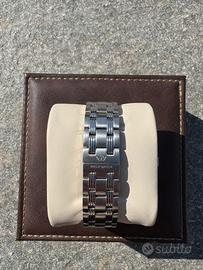 Orologio Philip Watch Blaze Questo cronografo da uomo si distingue per la sua cassa robusta in acciaio e un elegante bracciale in metallo color argento, che si chiude con una pratica fibbia a farfalla. Il quadrante è protetto da un resistente vetro minerale, garantendo chiarezza e durabilità. Movimento al quarzo, con libretto di originalità e garanzia. Resistente all’ acqua fino a 10 atmosfere. Mai indossato, mancante solo di una maglia del cinturino. Prezzo commerciale 400€