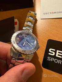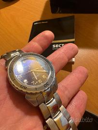Bellissimo orologio Sector No Limits serie 450, con stupendo fondo blu cangiante. Vintage, anni '90. Acciaio inox, cristallo zaffiro, waterproof 200 metri, made in Switzerland. Referenza 450 2653450035 Completo di scatola (questa non in ottime condizioni) e documentazione. Sul quadrante c'è ancora il film adesivo protettivo. Nuovo, indossato solo per prova, presenta qualche lieve segno da stoccaggio, minimi, basta lucidarlo e torna perfetto. Batteria nuova messa a gennaio 2026 (scontrino disponibile). Valuto scambi / permute con Seiko, Breil, Citizen, Casio, Tag Heuer.