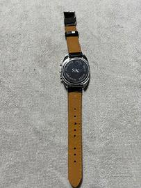 Quadrante nero con dettagli rossi, funzione cronografo, datario e cinturino in acciaio inox.