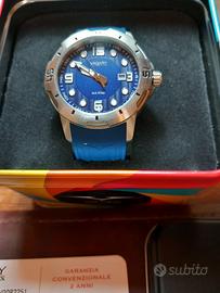 orologio al quarzo Vagary, cinturino in gomma azzurro come lo sfondo, wr 10 bar, garanzia dal 06/2024, confezione originale in alluminio, nuovo e poco usato, € 40,00.