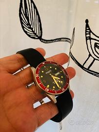 Ref. IX3-319-52 Orologio da uomo Vagary, modello Solotempo, movimento a ricarica automatica cal 8200 con rotore personalizzato. 21 rubini, 21600 alternanze. 42 ore di riserva di carica. Cassa in acciaio con fondo a vite e oblo trasparente. Movimento a vista. Ghiera girevole in alluminio. Vetro minerale bombato. Quadrante analogico di colore nero, dimensioni cassa 40mm e cinturino in silicone nero. Impermeabile fino a 10bar. Doppio cinturino in silicone. Indossato poche volte, pari al nuovo.