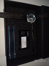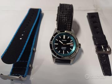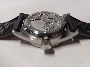 Skindiver con impermeabilità 200m e movimento Sellita sw200, diametro 38mm. Sistema anti shock incablock, scala pulsometrica su base 30 pulsazioni. Corredato di 2 cinturini tropic + 1 nato, spernatore, panno pulizia, card di garanzia, istruzioni, scatola e controscatola. Listino attuale € 1050. Usato pochissimo, perfetto meccanicamente ed esteticamente.