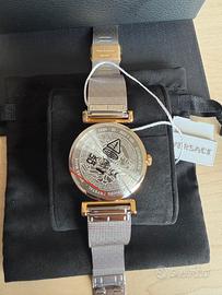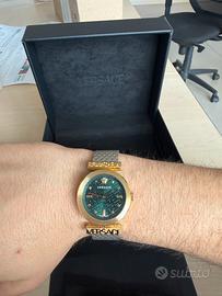 Elegante e raffinato, questo modello della linea Regalia rappresenta perfettamente lo stile iconico di Versace. Il quadrante verde con lavorazione geometrica dona profondità e carattere, impreziosito dal logo Medusa e dettagli dorati che richiamano il lusso del brand. La cassa color oro si abbina perfettamente al cinturino in maglia metallica, creando un contrasto moderno e distintivo. Un accessorio ideale sia per outfit eleganti che per un look più casual ma curato. Caratteristiche principali: •Modello: Regalia VE6J00623 •Movimento al quarzo (precisione e affidabilità) •Cassa in acciaio con finitura dorata •Quadrante verde con texture geometrica •Logo Versace e Medusa iconica •Cinturino in maglia metallica •Chiusura regolabile •Resistente agli schizzi Condizioni: Appena acquistato Prezzo originale: 990€ Per foto più dettagli o informazioni non esitare a contattarmi.