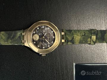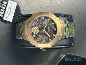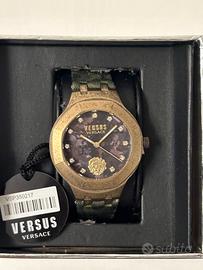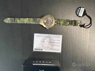 Vendo orologio Versus Versace originale. Quadrante con dettagli dorati e indici con cristalli. Cassa color oro anticato. Cinturino in tessuto camouflage verde. Completo di: – scatola originale – cartellini – libretto – card di garanzia Mai indossato. Mai riparato. Mai lucidato. Batteria da verificare (non testata di recente). Perfetto per chi cerca un orologio deciso, sportivo, non banale. Marca Versus Versace