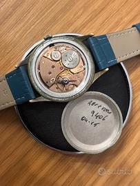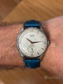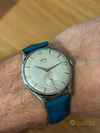 Splendido orologio vintage Vetta 17 Rubis, produzione svizzera degli anni ’50-’60, in ottime condizioni per la sua età. Caratteristiche tecniche: ∙ Cassa con fondello in acciaio, diam. 36,5 mm ∙ Quadrante originale con elegante texture guilloche (motivo a nido d’ape), indici arabi dorati e lancette a freccia ∙ Sotto-quadrante dei secondi a ore 6 (small seconds) ∙ Movimento meccanico pulito, a carica manuale. 17 rubini antimagnetic ∙ Iscrizione fondello: Stainless Steel Back – Swiss Made, n° 4051 1 ∙ Cinturino nuovo in pelle blu aftermarket, ansa 18mm • Movimento funzionante tiene l’ora regolarmente Un po’ di storia del marchio: Il progetto Vetta nacque nei primi anni ’30, quando la manifattura svizzera Wyler volle entrare nel mercato italiano, stringendo un accordo con il distributore milanese Lucio Binda per vendere i propri orologi con il nome “Wyler Vetta”. Binda si rivelò un pioniere del marketing: il marchio sponsorizzò la Nazionale italiana vincitrice della Coppa del Mondo 1934 e nel 1956 organizzò il lancio di due orologi dalla Torre Eiffel, dimostrando la robustezza dei propri segnatempo. Nel 1948 Wyler Vetta divenne sponsor ufficiale della Mille Miglia, e nel 1975 Enzo Ferrari personalizzò il proprio orologio Vetta. Un marchio con radici profonde nella storia italiana del ’900 — indossato da campioni, attori e piloti leggendari.