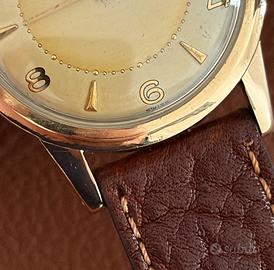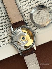 Propongo in vendita bellissimo pezzo vintage anni ‘60, Eterna Matic con cassa in acciaio gold cap da 34mm escluso corona, 41mm lug to lug, movimento automatico con calibro 1249T, corona di carica originale logata, cinturino in pelle di ottima qualità con fibbia placcata oro.