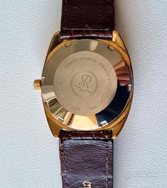 Raro orologio vintage automatico da polso, originale, prodotto dalla rinomata casa svizzera Vulcain negli anni 1970, con cassa in acciaio inox placcata oro (eccetto il fondello). Il movimento è di altissima qualità ETA cal. MSR T56, 22 rubini, 50 ore di riserva di carica [nel 1961, le società Revue, Vulcain, Buser e Phénix si fusero per formare "Manufactures d'Horlogerie Suisse Réunis SA" (MSR)]. Fondello con chiusura a vite. Orologio impermeabile. Funzioni del quadrante: dodici ore, data, lancetta centrale dei secondi. Diametro della cassa 35 mm esclusa la corona. Spessore dell’orologio 11 mm. Cinturino generico in vera pelle. Orologio in ottime condizioni e funzionante. A corredo dell’orologio, rarissima scatola originale Vulcain pure in ottime condizioni.