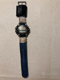 Il cinturino è quello originale, in tessuto blu e dettagli in pelle che presentano segni di usura.