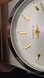 Il quadrante è color grigio perla, timbrato CITIZEN Automatic con il logo dell'aquila con il numero 7 sul petto e la dicitura "21 jewels", alle 6 l'orologio è firmato P-8200 6-S80552 SMO
