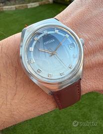 Orologio vintage Citizen New Master anni 70 Meccanico a carica manuale cal. 1802 Cassa in acciaio diametro 37mm Stupendo quadrante con finiture soleil sfumato azzurro Vetro plexi senza graffi Corona originale logata Cinturino e fibbia generici Orologio perfettamente funzionante e preciso.
