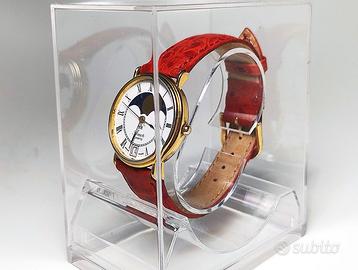 Grande finestra da ore 10 ad ore 14 a forma di spicchio che mostra le stelle e la fase lunare in corso. La placcatura in oro è in ottimo stato di conservazione, risulta leggermente usurata in prossimità degli agganci del cinturino ma non si nota. Il vetro non presenta segni. Da considerare che ha quasi 50 anni.
