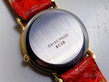 Elegante orologio da donna Swiss Made sia cassa che movimento Svizzero marchio "AM AMOR" con movimento "FE France Ebauche" oggi ETA. Quadrante bianco porcellana con numeri romani e datario ad ore sei, sfere oro a forma di lancia con punta nera. Cinturino da 16 mm in vera pelle, nuovo mai indossato.