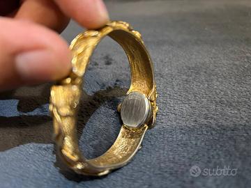 Questo raffinato segnatempo si presenta in una splendida versione a bracciale rigido con coperchio decorativo apribile, che nasconde il quadrante come fosse un vero e proprio gioiello d’epoca. Il bracciale è interamente lavorato con motivo floreale/ramage in rilievo, realizzato in metallo dorato finemente cesellato, con inserti in stile foglia e bocciolo.