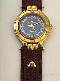 Questo è un orologio Maurice Lacroix vintage al quarzo da donna con quadrante blu, cassa placcata oro e cinturino in pelle marrone.