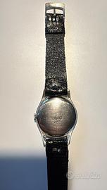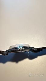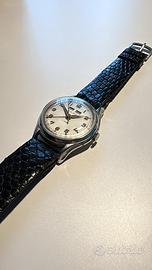 Il quadrante mostra segni del tempo che aggiungono carattere e autenticità, con numeri arabi ben leggibili e finestrelle dedicate per giorno e data. Cassa in acciaio e cinturino nero in pelle con effetto lucertola, sostituito di recente.