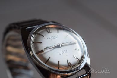 Vendo dalla mia collezione personale questo elegante orologio Mirexal Genève, con movimento meccanico a carica manuale FHF ST e 17 rubini. L’orologio è funzionante e in buone condizioni estetiche per l’età, con quadrante pulito e cassa ben conservata di 33mm ca. Monta un bracciale elastico in acciaio.