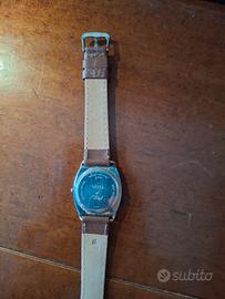 Orologio al quarzo modello vintage Vetta "de l'Etoile" ; cassa bicolore (lunetta dorata e corpi in acciaio) ; quadrante bianco con numeri arabi neriin stile classico a finestrella; cinturino in pelle marrone mis 16; non funzionante